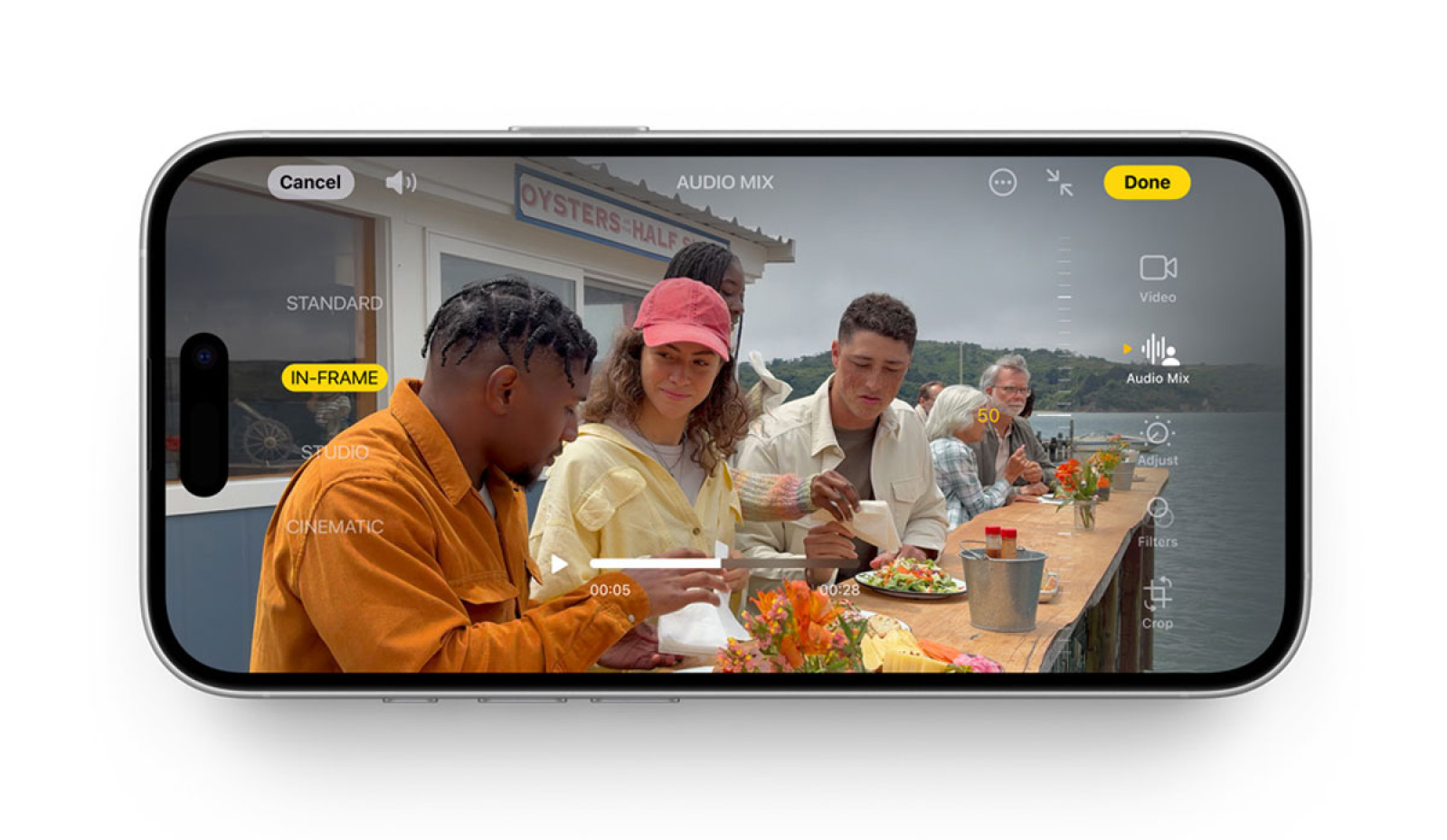 Благодаря передовому интеллекту и захвату пространственного звука Audio Mix позволяет вам настраивать звучание голосов в ваших видео с помощью трех различных вариантов голоса. Хотите уменьшить фоновый звук? Или просто сосредоточиться на голосах в кадре? Просто выберите микс и отрегулируйте интенсивность, чтобы получить нужный вам звук после захвата видео.