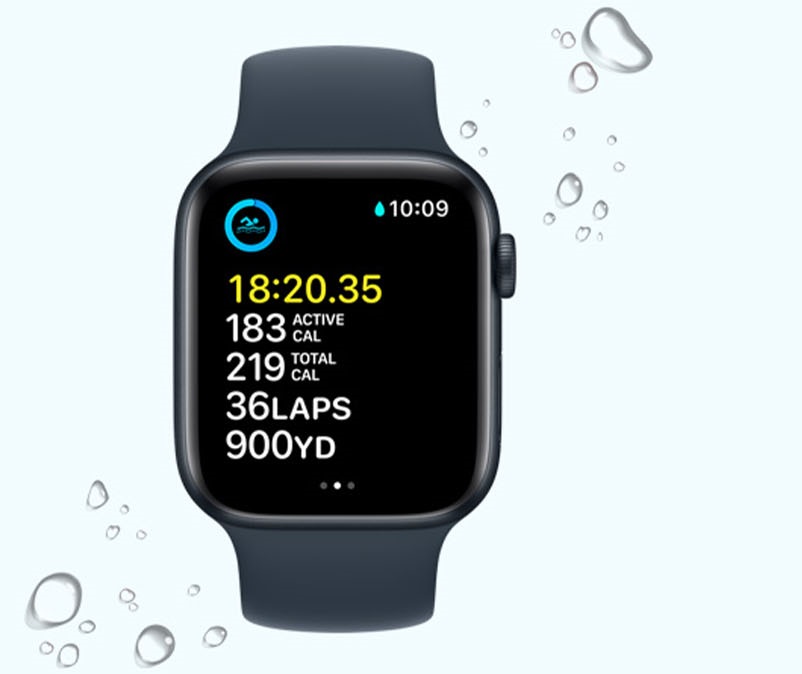Apple Watch SE водонепроницаемы на глубине 50 метров. Отслеживайте свои сплиты и сеты в бассейне. Наметьте свой маршрут в открытой воде. Просматривайте точные показатели даже при использовании кикборда. Если вы плещетесь, плаваете или занимаетесь серфингом, вода в порядке.
