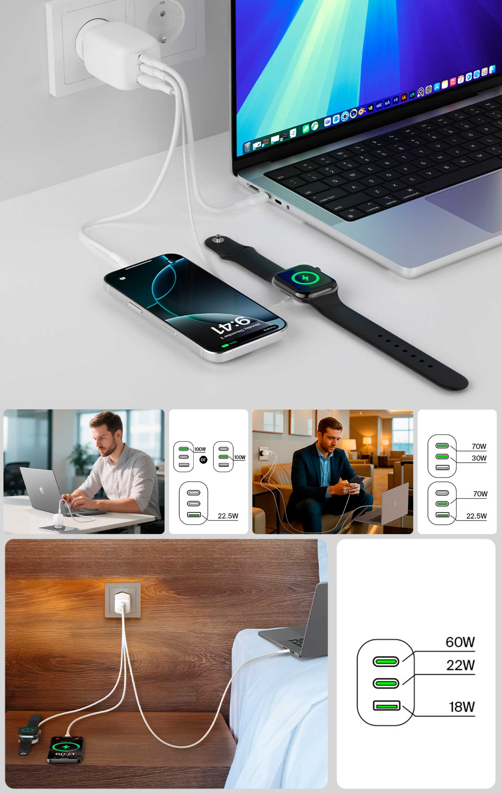 Два порта USB-C для телефонов и ноутбуков, один порт USB-A для часов или наушников — заряжайте несколько устройств одновременно.