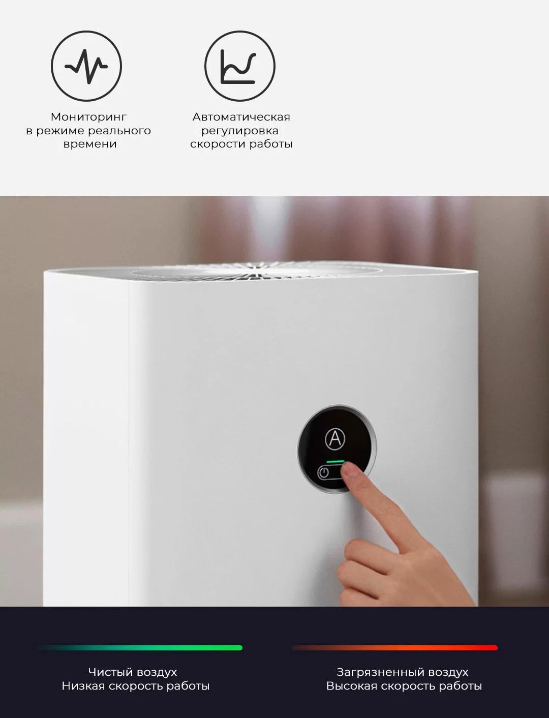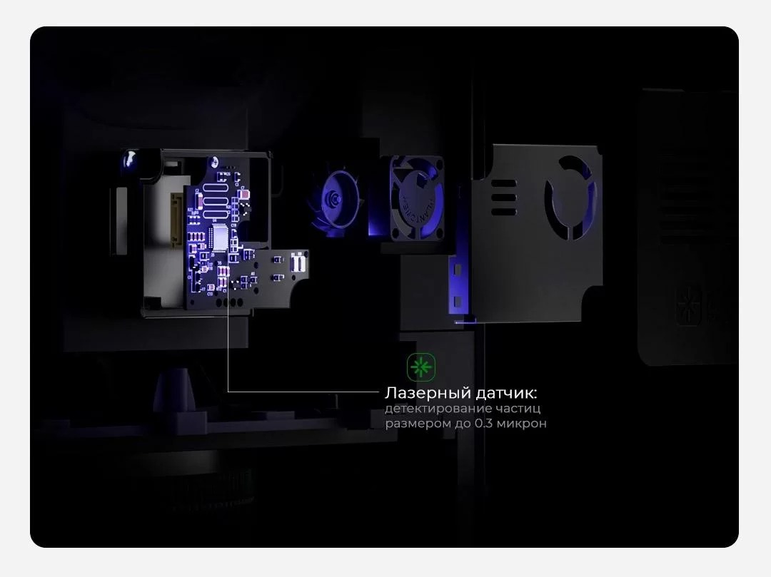 Автоматический редуктор и высокоточный лазерный датчик позволяют точно отслеживать изменения качества воздуха и регулируют режим работы устройства в соответствии со степенью загрязнения.