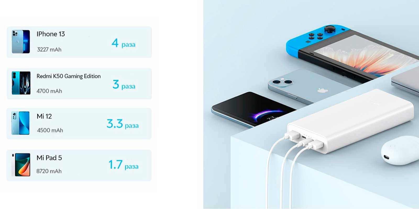 Внешний аккумулятор Xiaomi Mi Power Bank 20000 mAh 22.5W имеет два порта USB-A один, порт USB-C, все разъёмы могут работать одновременно, поддерживая различные устройства, такие как смартфоны, планшеты, браслеты Xiaomi и другие