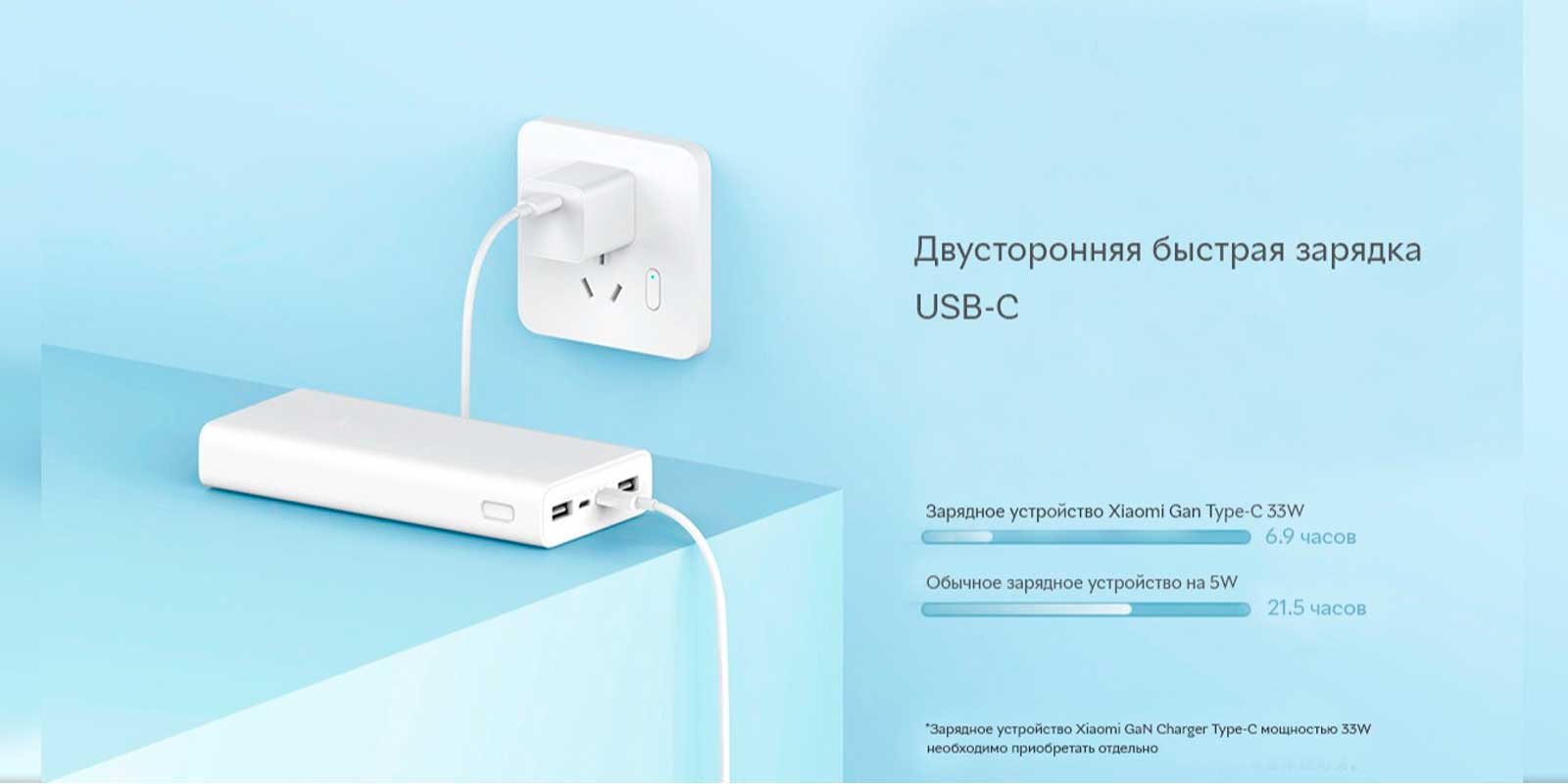 Интерфейс USB-C поддерживает двустороннюю зарядку, а также максимальную входную мощность 22.5W MAX. При помощи USB-зарядного устройства Xiaomi GaN 33W Power Bank может заряжаться около 6.9 часов.