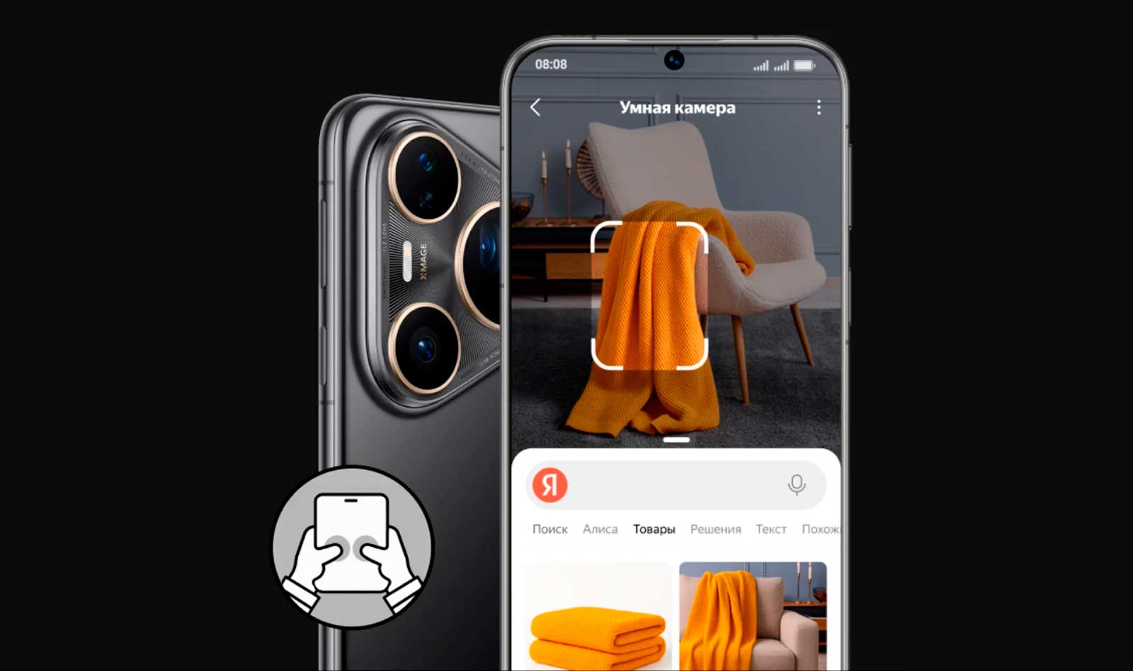 Нажмите двумя пальцами на экран для быстрого поиска*. Жест откроет Умную камеру Яндекса, которая распознаёт объекты и помогает узнать больше. Можно сразу уточнить: «Хочу такой же плед, но красный» — и получить результат.
