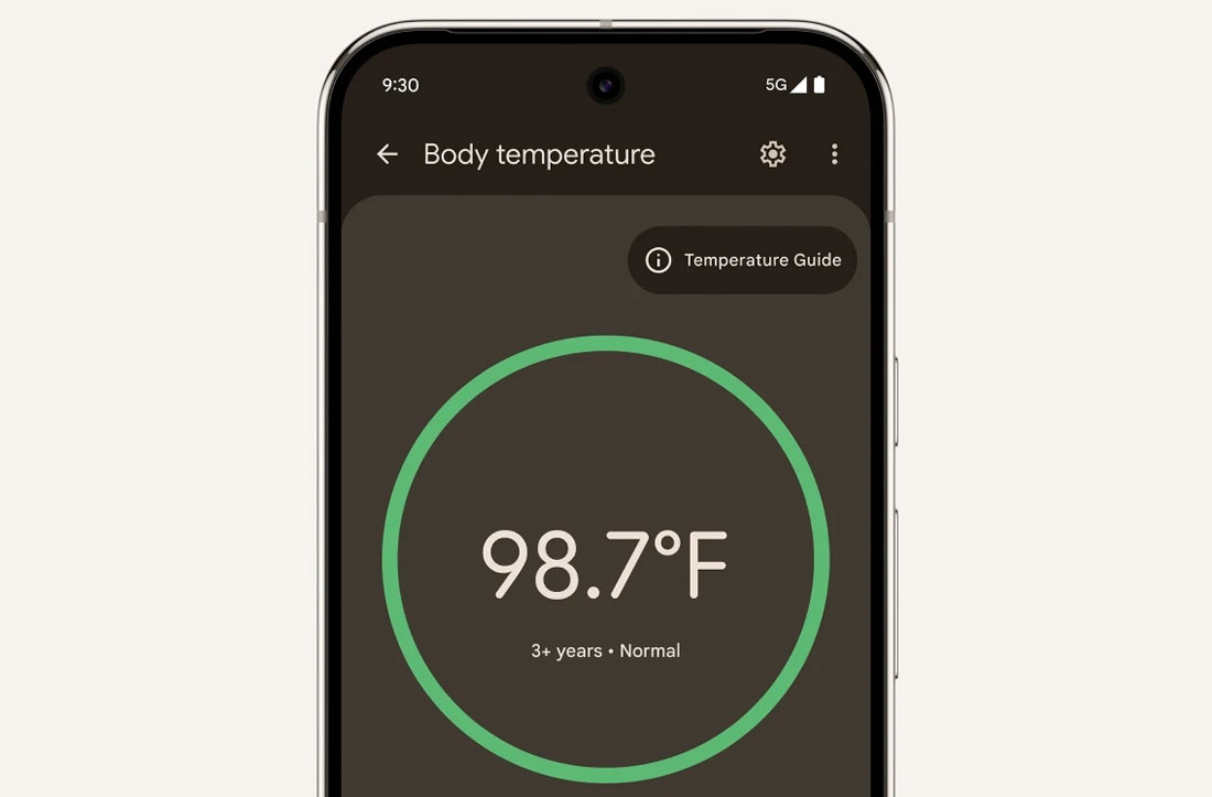 Приложение Thermometer на Pixel 9 Pro XL позволяет вам измерять свою температуру (или температуру другого человека) простым сканированием лба и сохранять результаты в своем профиле Fitbit.