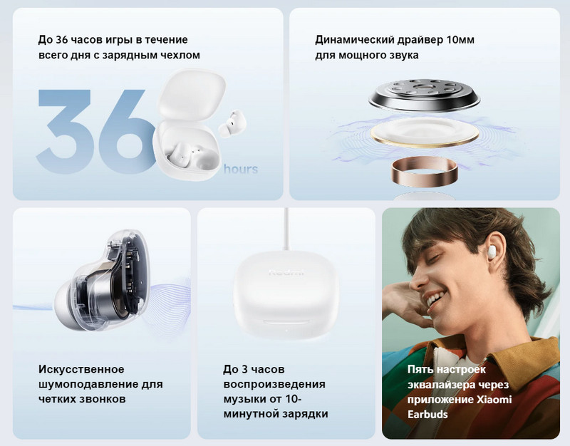 Беспроводные наушники Redmi Buds Play — с динамическим драйвером размером 10 мм, интеллектуальным шумоподавлением, автономностью до 36 часов и предустановленными настройками эквалайзера станут отличным выбором для прогулок, звонков, прослушивания музыки, фильмов и занятий спортом.