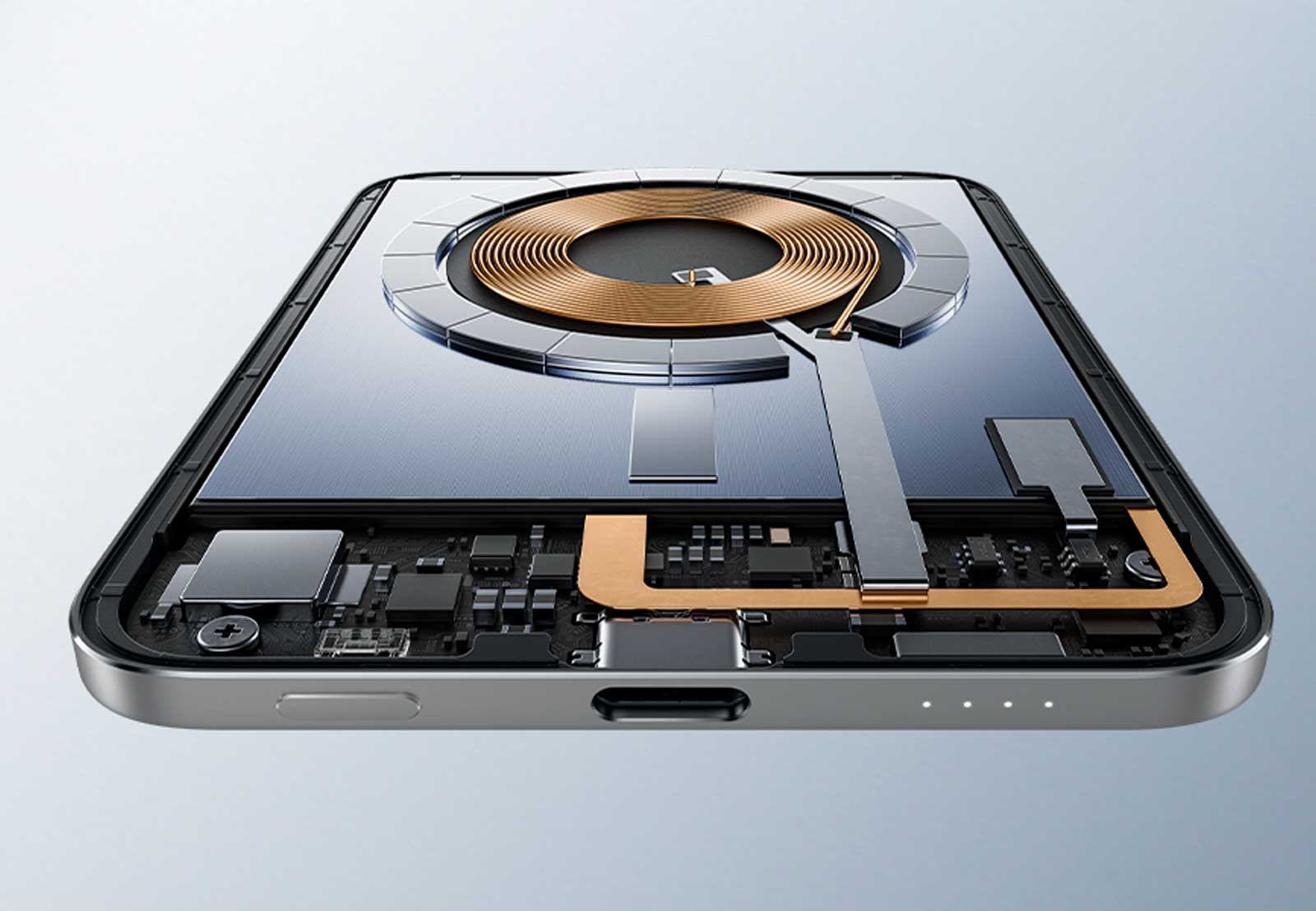 Для стабильной работы под нагрузкой внешний аккумулятор оснащён графитовым теплоотводящим листом площадью 4369 мм², который эффективно рассеивает тепло. Дополнительно применяются два терморезистора NTC, отслеживающие температуру в режиме реального времени и автоматически корректирующие параметры зарядки. Такой подход минимизирует тепловые потери и повышает долговечность устройства при интенсивной эксплуатации.