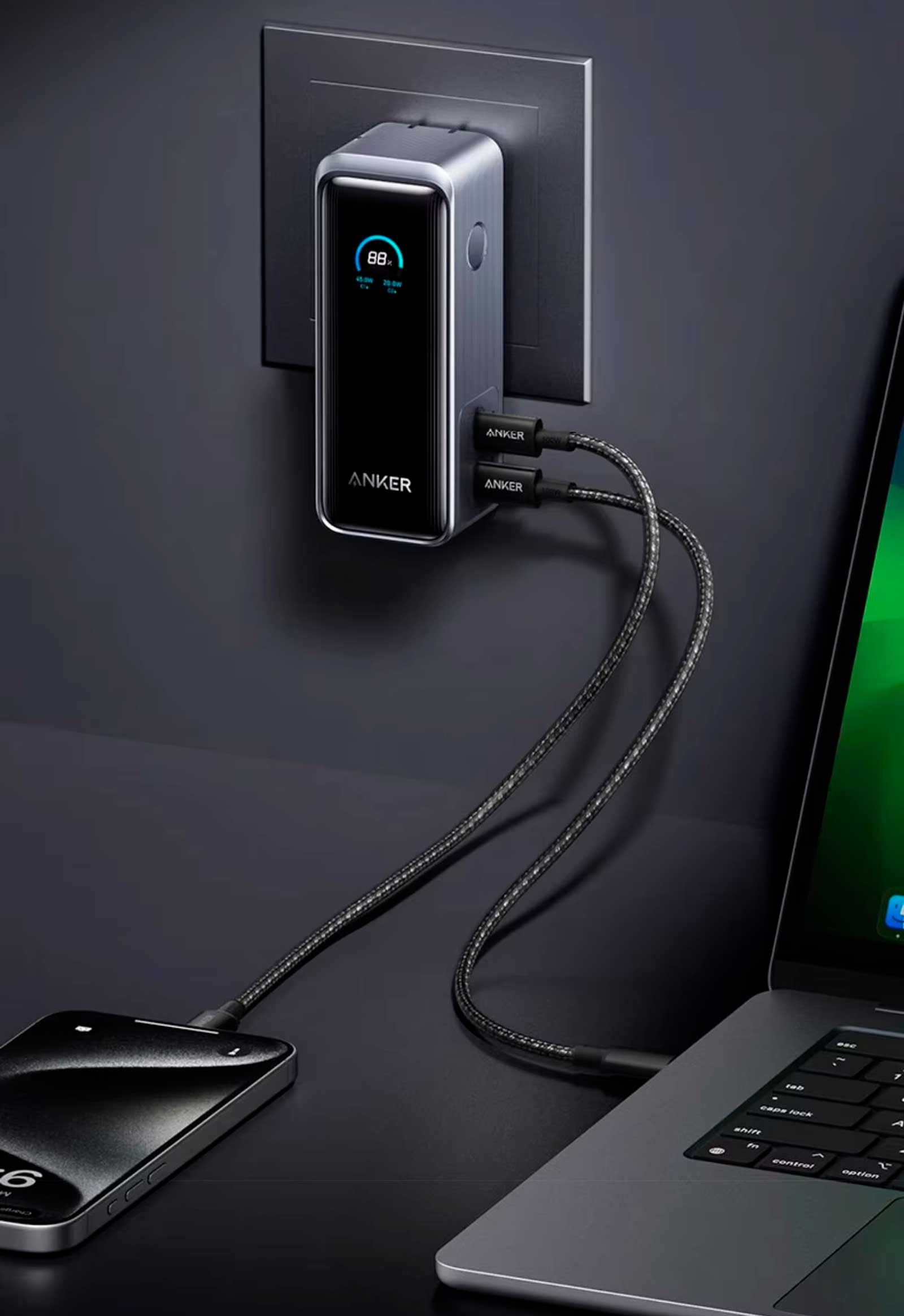 Обеспечивает мощность до 65 Вт. Максимальные 65 Вт доступны при использовании одного порта. При одновременной зарядке нескольких устройств порт USB-C1 выдаёт до 45 Вт, а USB-C2 — до 20 Вт.